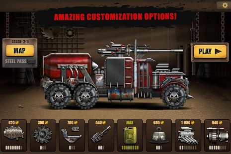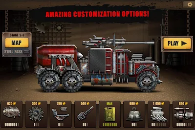 O jogo apresenta uma variedade de veículos que podem ser usados pelos jogadores, incluindo carros, caminhões e motocicletas, todos adaptados para enfrentar o terreno difícil e os obstáculos do mundo pós-apocalíptico. Cada veículo tem habilidades e características únicas que podem ser atualizadas e aprimoradas com moedas coletadas durante o jogo.